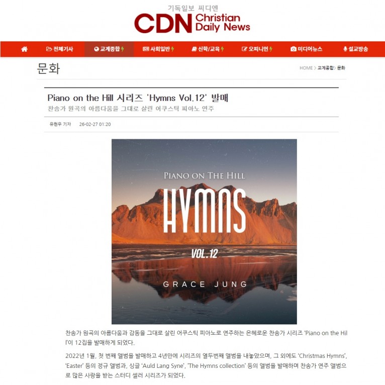 [기사] Piano on the Hill 시리즈 'Hymns Vol.12' 발매(기독일보 씨디엔)