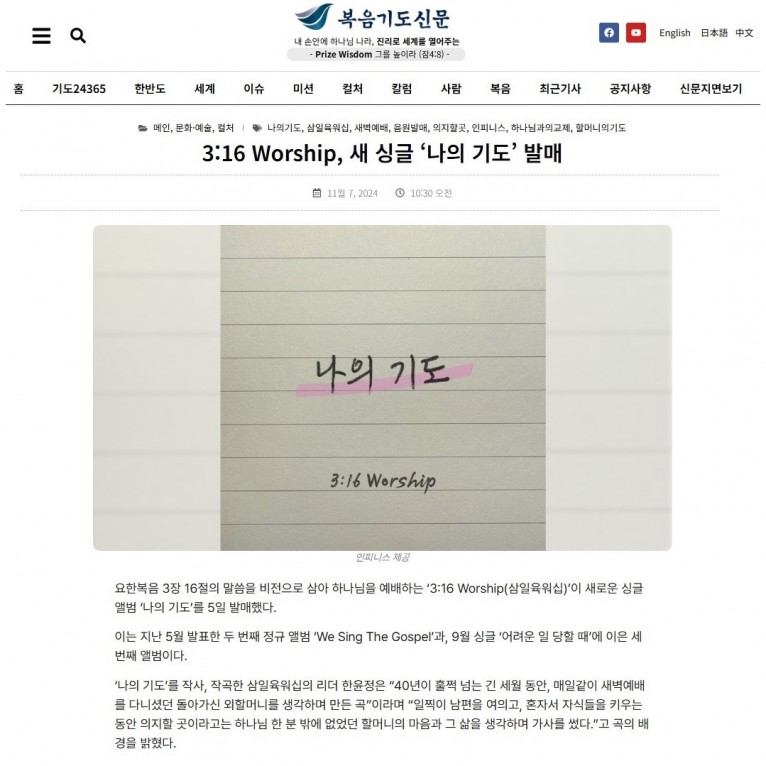 [기사] 3:16 Worship, 새 싱글 ‘나의 기도’ 발매(복음기도신문)